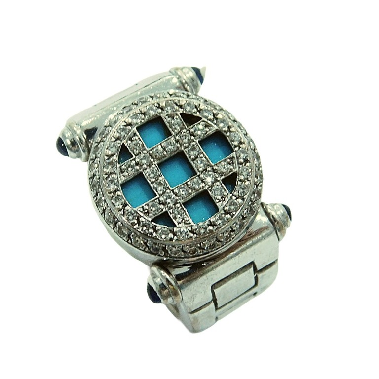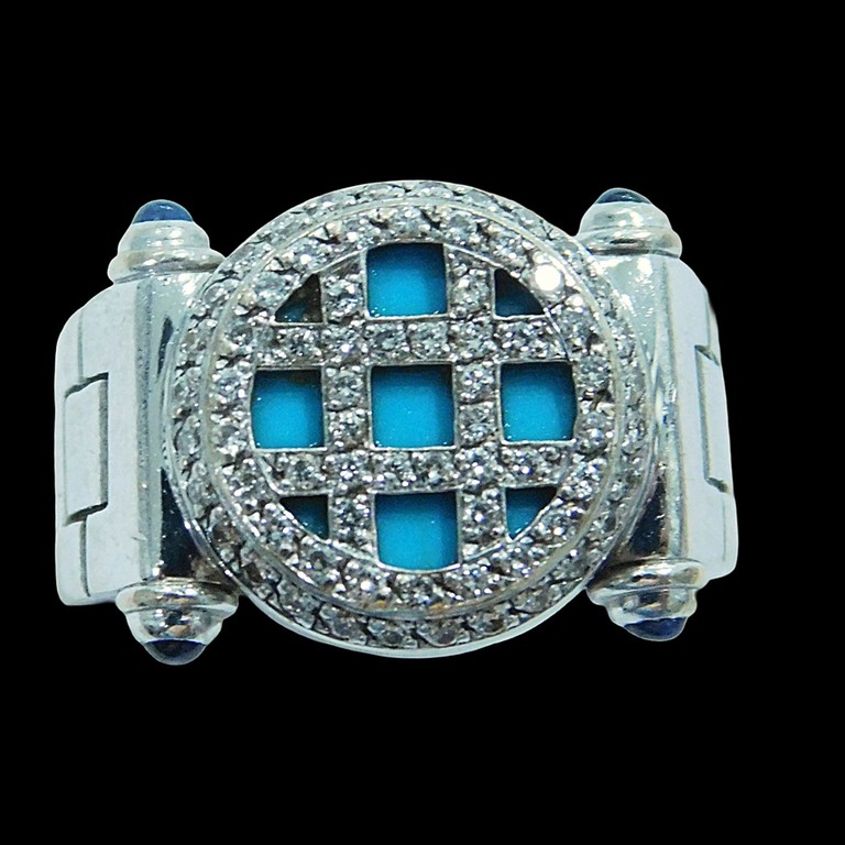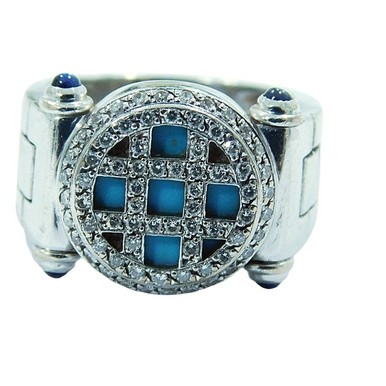 ANILLO ANCHO ORO BLANCO PIEDRA AZUL CENTRAL Y MINI CIRCONITAS T:14 17.42GR 18K