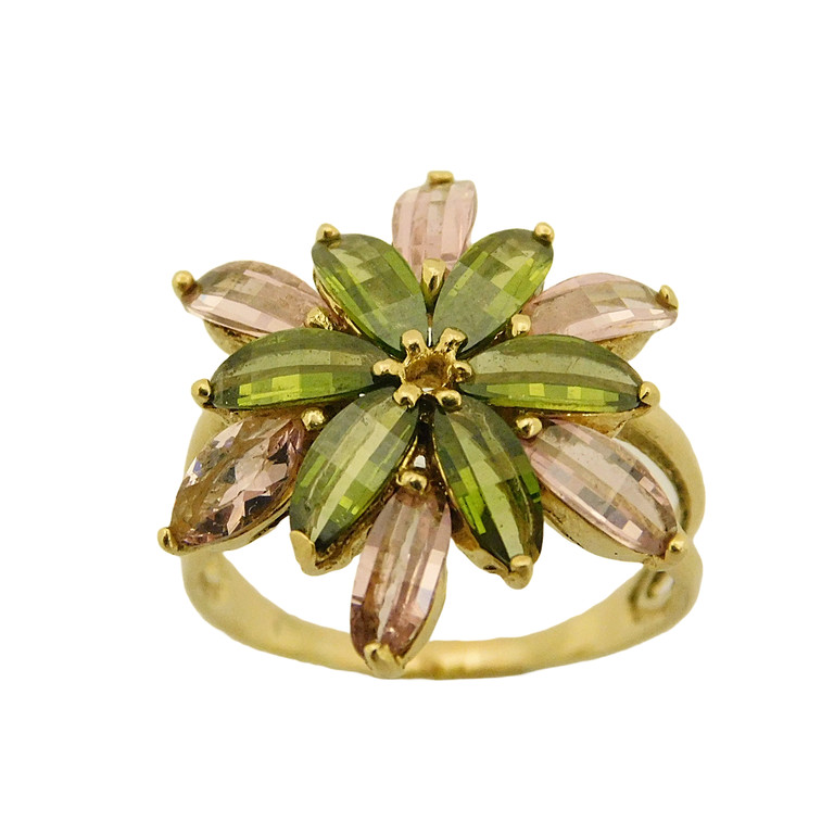 ANILLO DISEÑO FLOR CON MORGANITA ROSA Y TURMALINA VERDE TALLA 20, 6.05GR. 18KPiedras: PIEDRAS ROSAS Y VERDES
