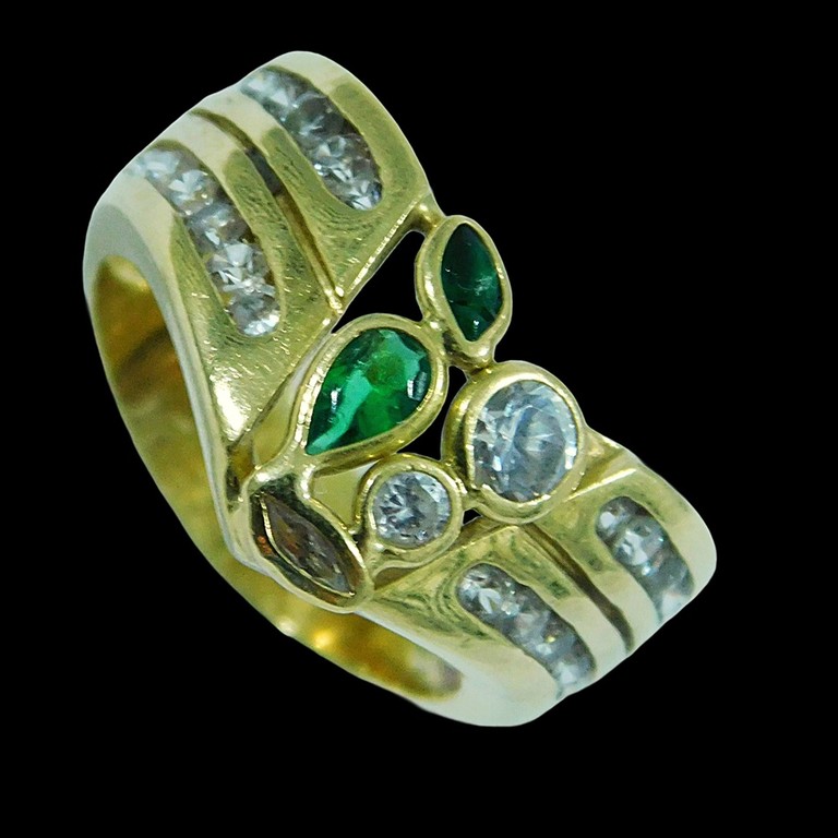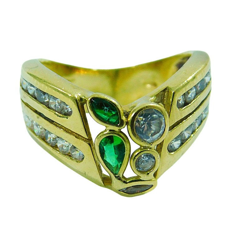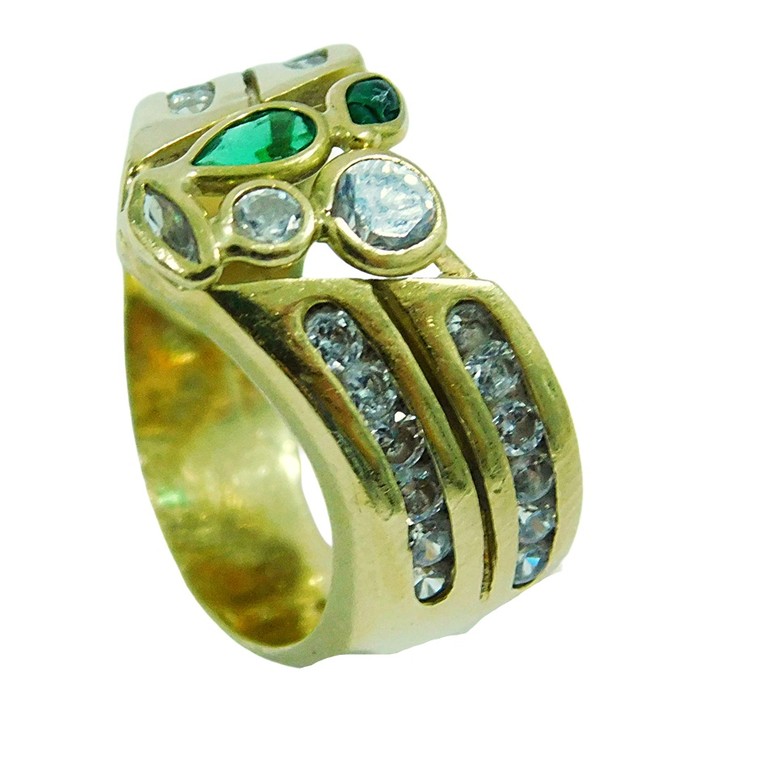 ANILLO PICUDO ANCHO RISTRAS CIRCONITAS BLANCAS Y VERDES T:15 7.53GR 18KPiedras: PIEDRAS VERDES Y BLANCAS