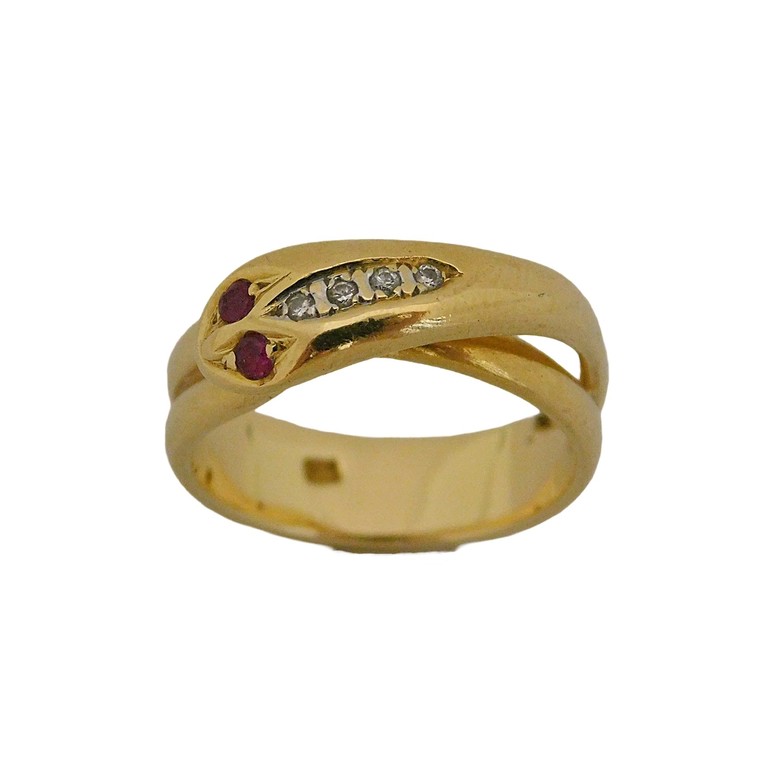 ANILLO SERPIENTE CON CIRCONITAS Y ESPINELA TALLA 15, 7.75GR. 18KPiedras: CIRCONITAS Y PIEDRA ROJA