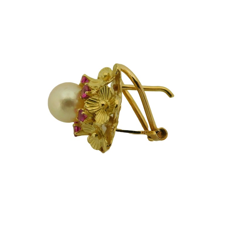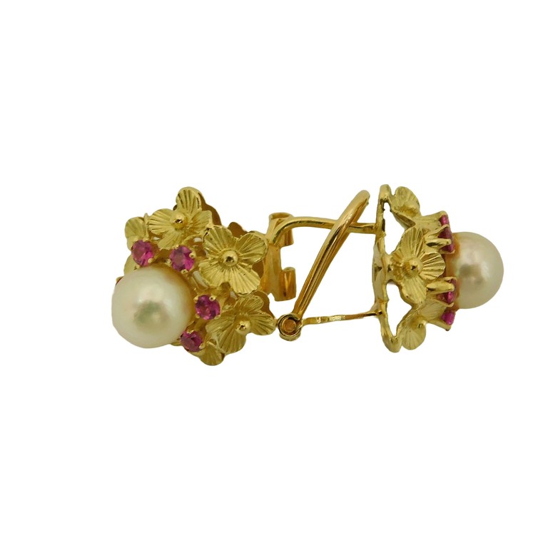 PENDIENTES DISEÑO FORAL CON PERLA BLANCA Y TOPACIO ROSA CON CIERRE OMEGA, 6GR. 18K